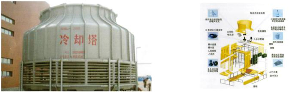Being a kind of equipment for heat exchange through direct contact of water and air,the cooing tower is mainlycomposed of draught fan,electrical machine.padding.Pumping-out system.tower body and water pan.and it achieves thepurpose of lowering water temperature through heat exchange of water in the padding and law temperature air under thedraught fan.